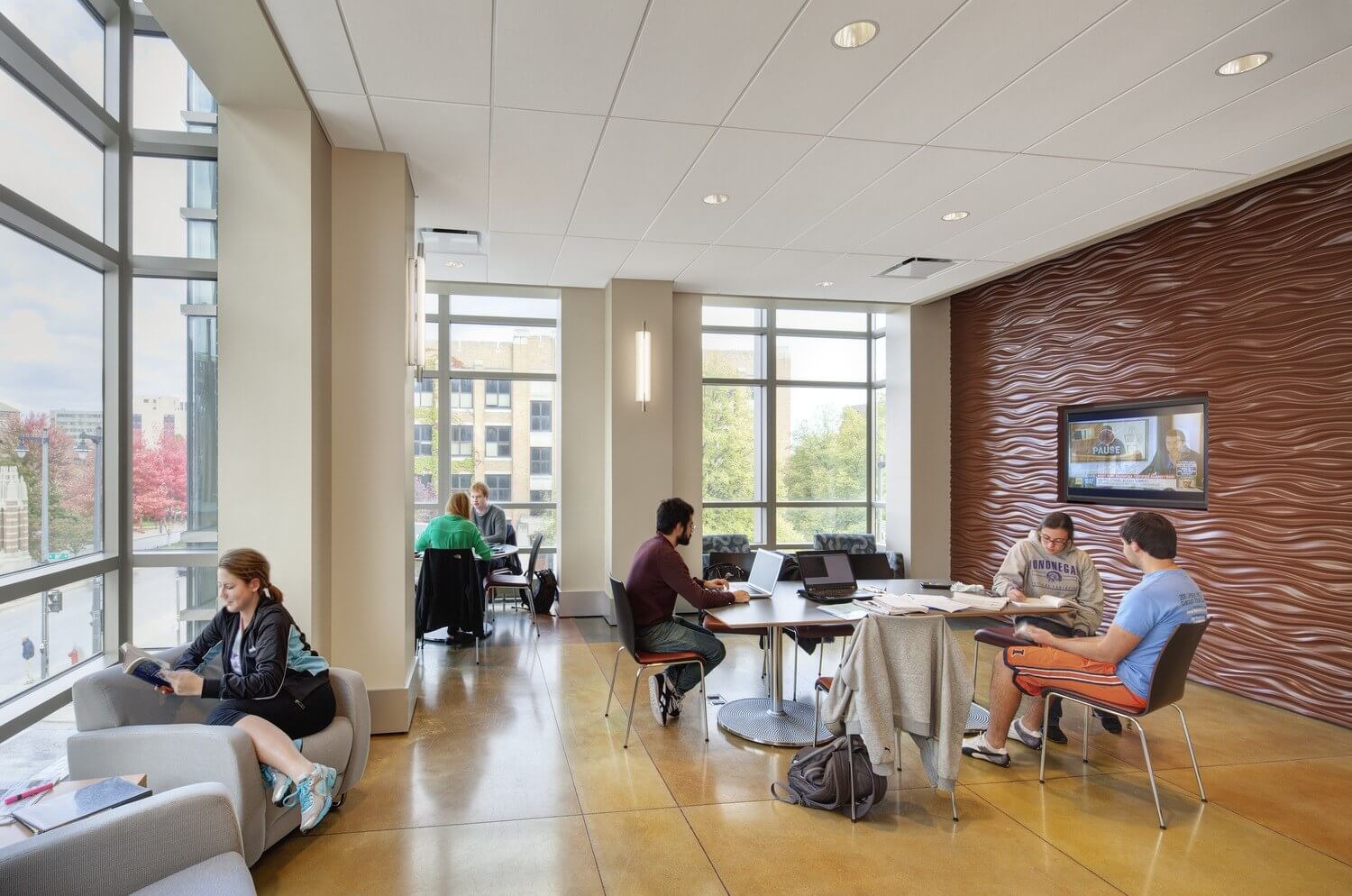 The building consolidates four engineering departments—biomedical, electrical, mechanical and civil—into one facility, furthering the College’s goal of facilitating interaction between departments. Each floor provides classrooms, undergraduate laboratories, and graduate research laboratories arranged thematically—rather than by department—to encourage innovation across disciplines. The design accommodates efficient laboratory space with an eye toward long-term flexibility. Continuous lab modules and gracious ceiling spaces throughout provide flexibility to allow the program to grow while remaining at the forefront of teaching methods.