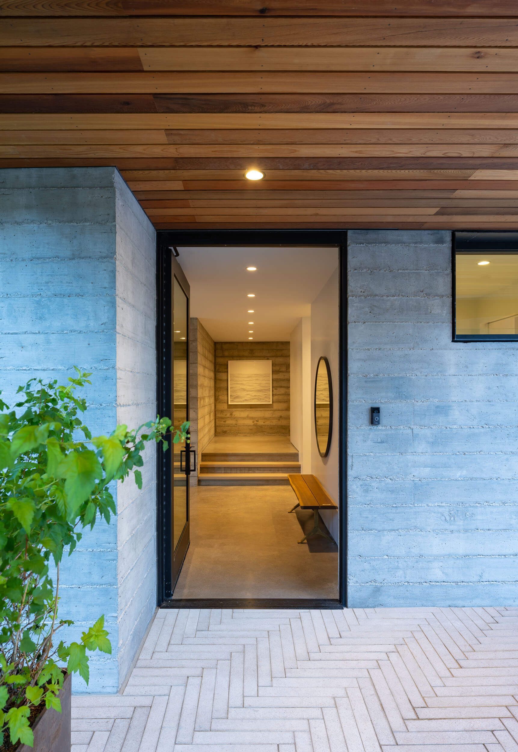 Rather than opting for a single, imposing structure, the project was envisioned as a collection of smaller buildings strategically nestled into the hillside, an approach chosen to avoid the visual dominance of a large singular structure. The house is distinctly modern in form, detail, and use of materials. Steel, wood, and board-formed concrete create a contemporary backdrop for the design’s focal point: large expanses of glass to maximize views and natural light.