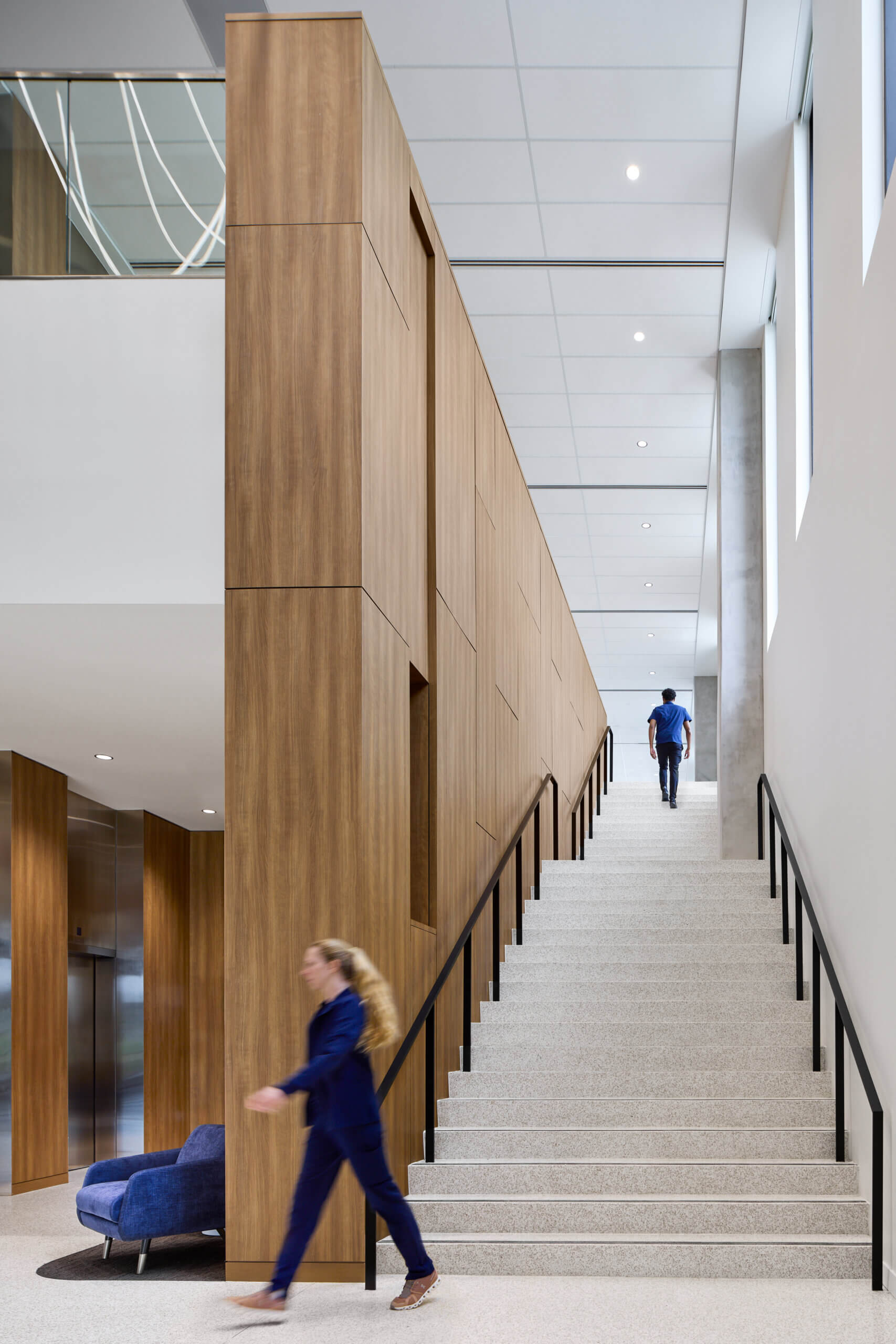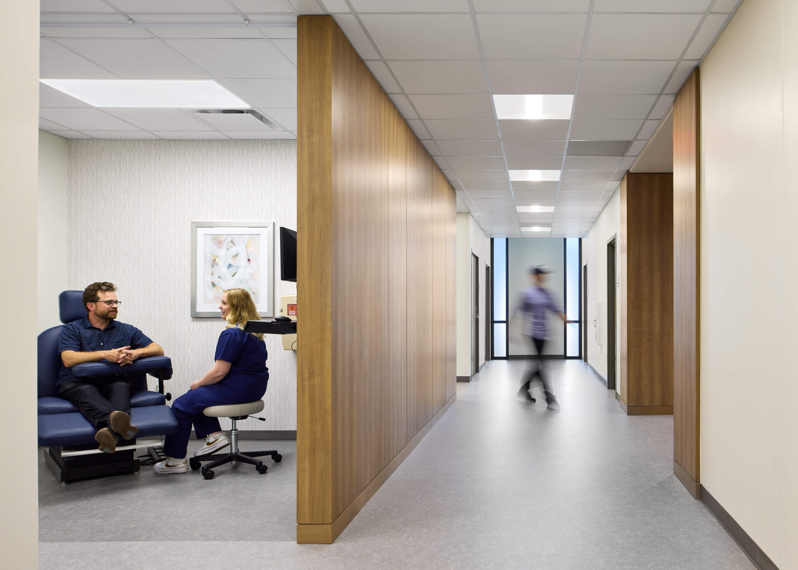 Designed for comfort, the center has 24 infusion rooms and 22 exam rooms with large windows for peaceful views of the campus pond and landscape. The lobby’s two-story entry leads to relaxing pond views, while a staircase full of natural light invites visitors into the building. A lower level hosts the imaging suites, administrative offices, a pharmacy, and room for future growth. Evidence-based design principles were applied and used to test the design of each space so it would meet the efficiency, operational, and experience needs of staff, patients and visitors.