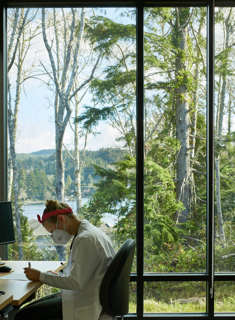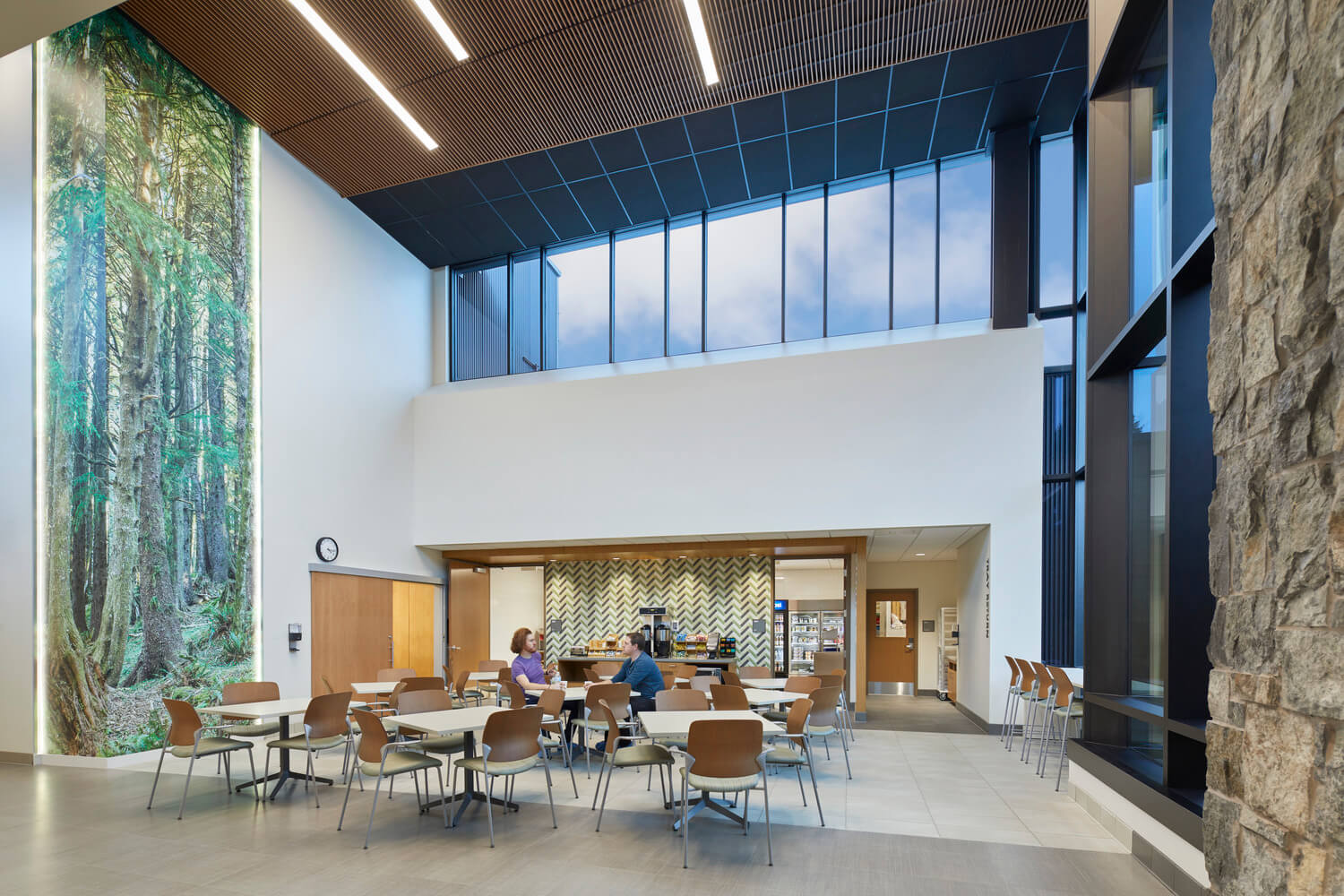 Architecturally, the hospital reflects the community’s rural location featuring dense mountain forests and coastline. The setting is showcased in the exterior and interior design as a journey through these distinct ecosystems, beginning with a “forest” of columns supporting the drop-off canopy and lending privacy to waiting areas near the entry. The journey transitions through images and textures inspired by Oregon’s coastline, and ends with striking views from inpatient rooms that overlook Devil’s Lake.