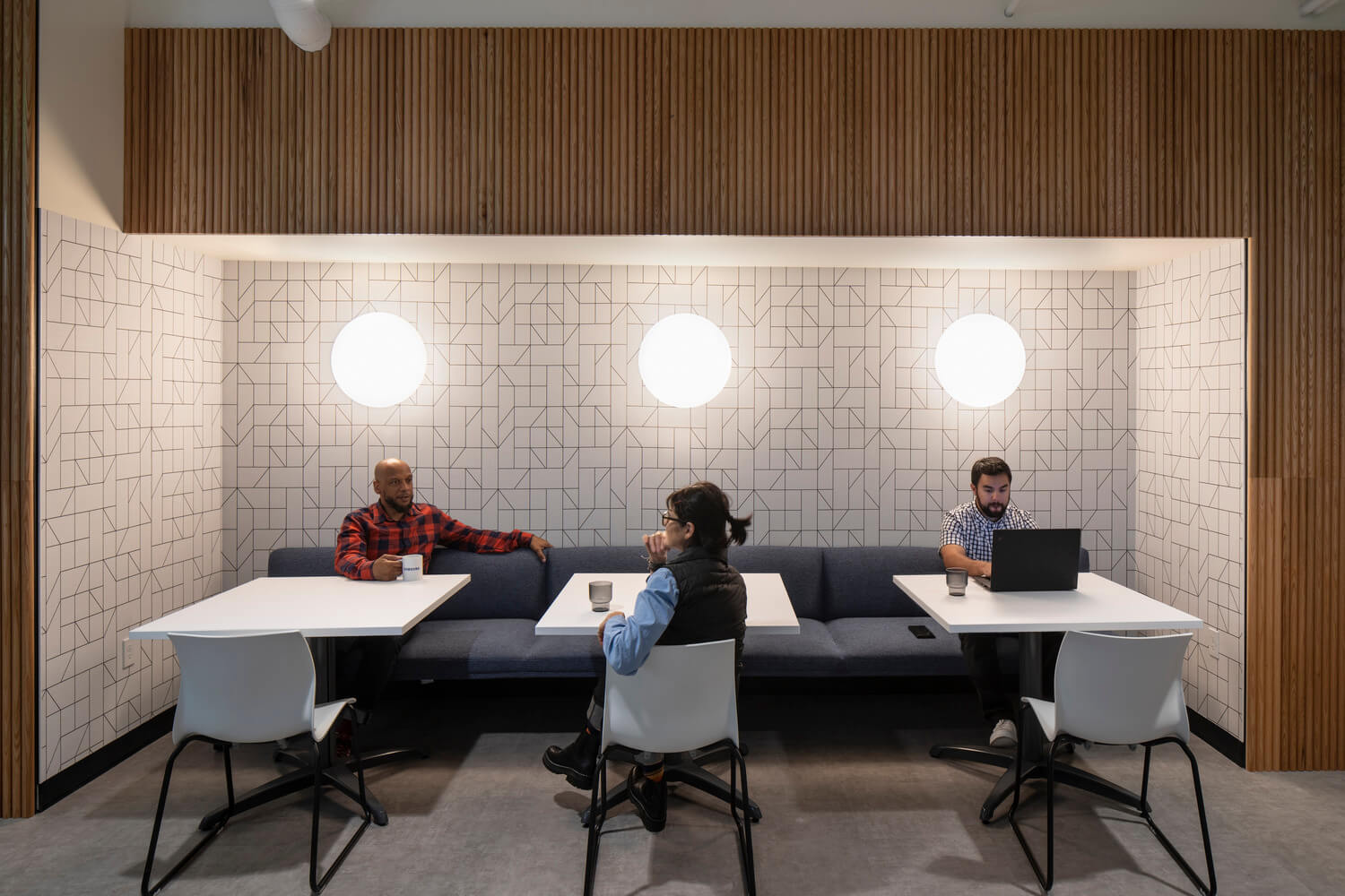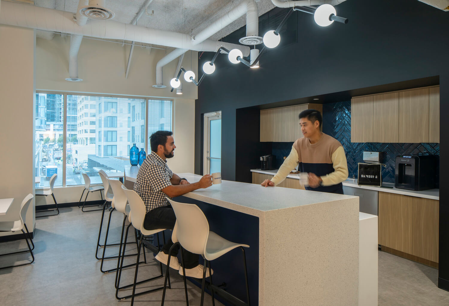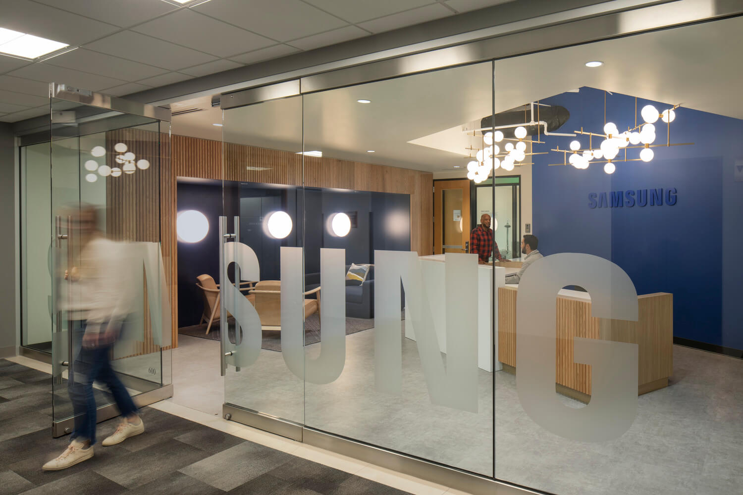 The 110 – seat open office space emphasizes circulation patterns, while drop ceilings enhance the acoustics. The open office allows access to natural light and views on all sides of their suite. Because Samsung has a particular standard for their office furniture, the workstations were relocated from their Redmond office and supplemented with new pieces, where necessary. The ancillary furniture complemented the social spaces. In addition, all kitchen appliances and A/V technology are Samsung products, further showing the breadth of the Samsung ecosystem. To allow for authenticate break time and to contain noise, the breakroom and gathering spaces are located away from the client-facing areas in the front of the office.