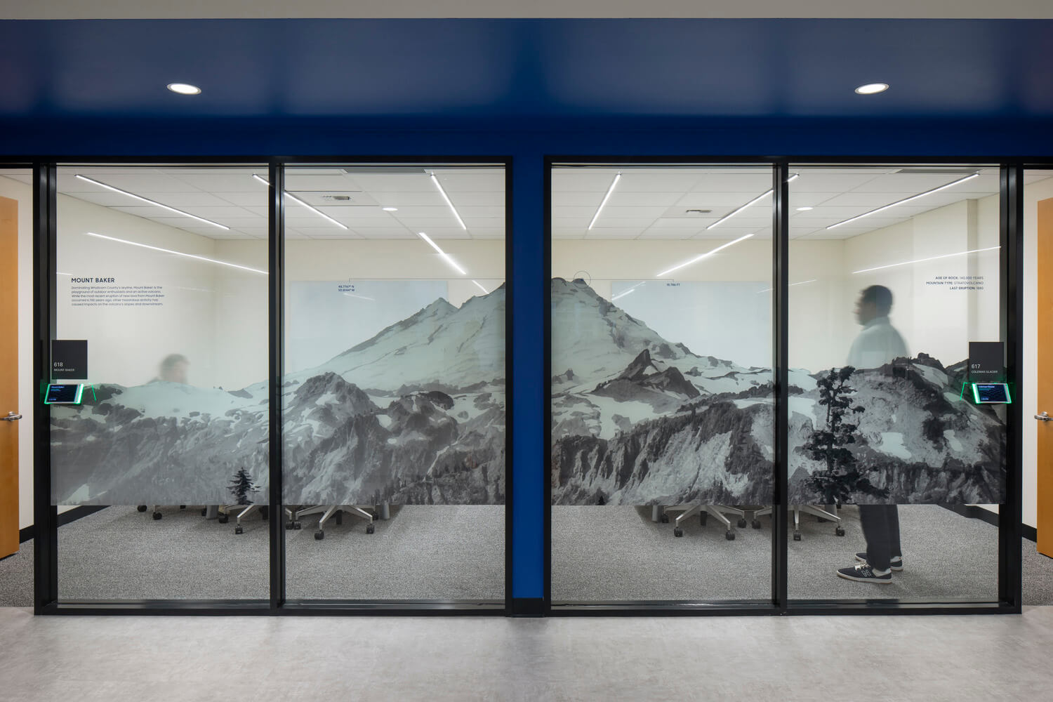 HGA and Samsung came together to create a welcoming workspace that celebrates Samsung’s brand. Their new office operates as a combination of client services, engineering, and product support. Elements of hospitality design were interwoven into the space, providing the feeling of a sleek and modern home. The arrival experience was particularly important, with large LED screens to welcome clients and warm colors and materials to make guests and employees feel at home. The brand color can be found throughout the space, including the reception, board room and smaller conference rooms, and is offset by warm and bright wood accents. In addition, two small balconies beckon employees and visitors to enjoy the views. Custom environmental graphics were developed for conference room glazing and walls to further enhance the brand and celebrates the local topography and landmarks of the Olympic Region.
