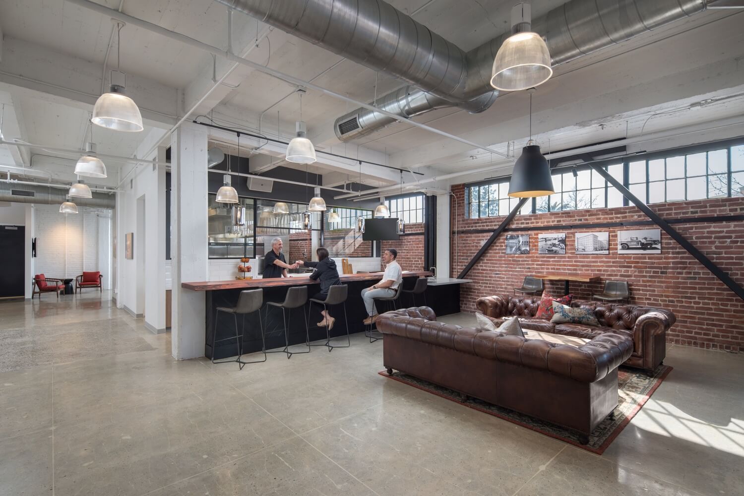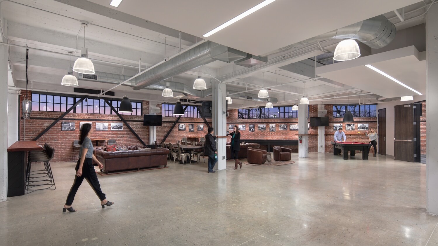 The property’s history played a significant role in the overall design inspiration. Starting in the early 1900s, the property served as the Libby, McNeil, and Libby Fruit and Vegetable Cannery. After Libby’s closed its doors in the 1980s, the property was redeveloped to convert its existing canning warehouses into offices. In that retrofitting and renovation, the structure was covered up and its natural materials were hidden from floor to ceiling. The exposed core of the building is now revealed; a significant departure from the traditional office environment found at the existing site. Interior elements suitable for today’s advanced tech campuses—open work areas, ample, natural full-height lighting and interior glazing partitions to create order—are also integrated throughout the property. At the same time, HGA’s design enhances and celebrates The Cannery’s raw beauty through materials authentic to the property, including brick, steel, concrete and divided lite glazing. Details such as structural beams, stamped numbers on each concrete column from the locations of original machinery and existing divided lite window systems nod to the history of The Cannery.