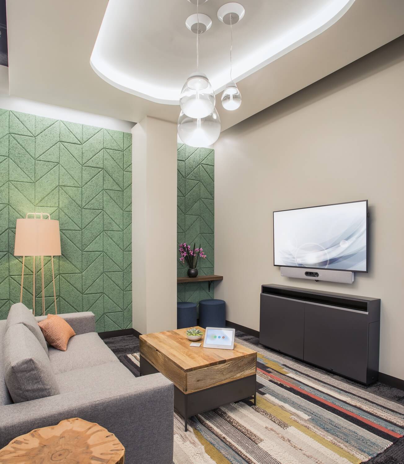 ServiceNow immediately sets a welcoming tone at the entrance. A comfortably furnished ‘living room’ with an informal dining and coffee bar greets employees and guests as they arrive. Serving double duty, the living room functions as both a waiting area for guests and central collaboration area for employees.