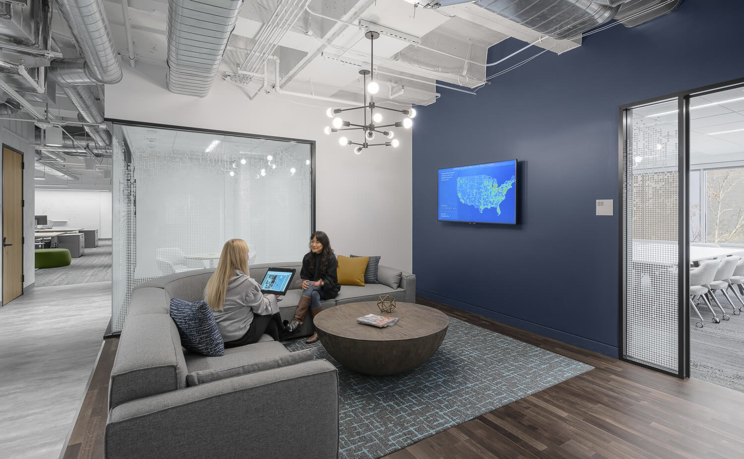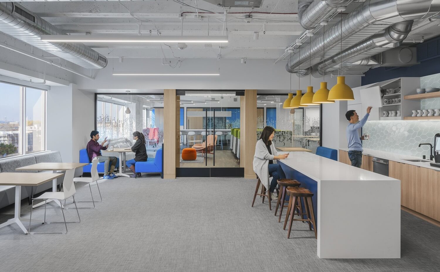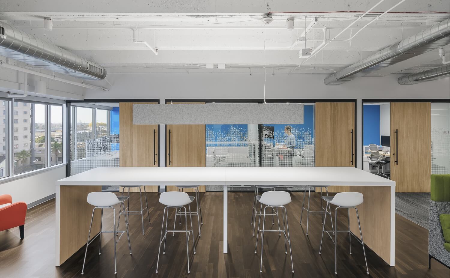 Throughout, natural materials are infused with pops of color balancing tech and comfort against a neutral background. Flexible, creative workspaces focus on function, collaboration, and wellbeing to promote creativity and energy. And small details nod to the software at the business core, such as wood slats that mimic the algorithm bars on the SleepIQ app and graphic window film recalling digital programming.