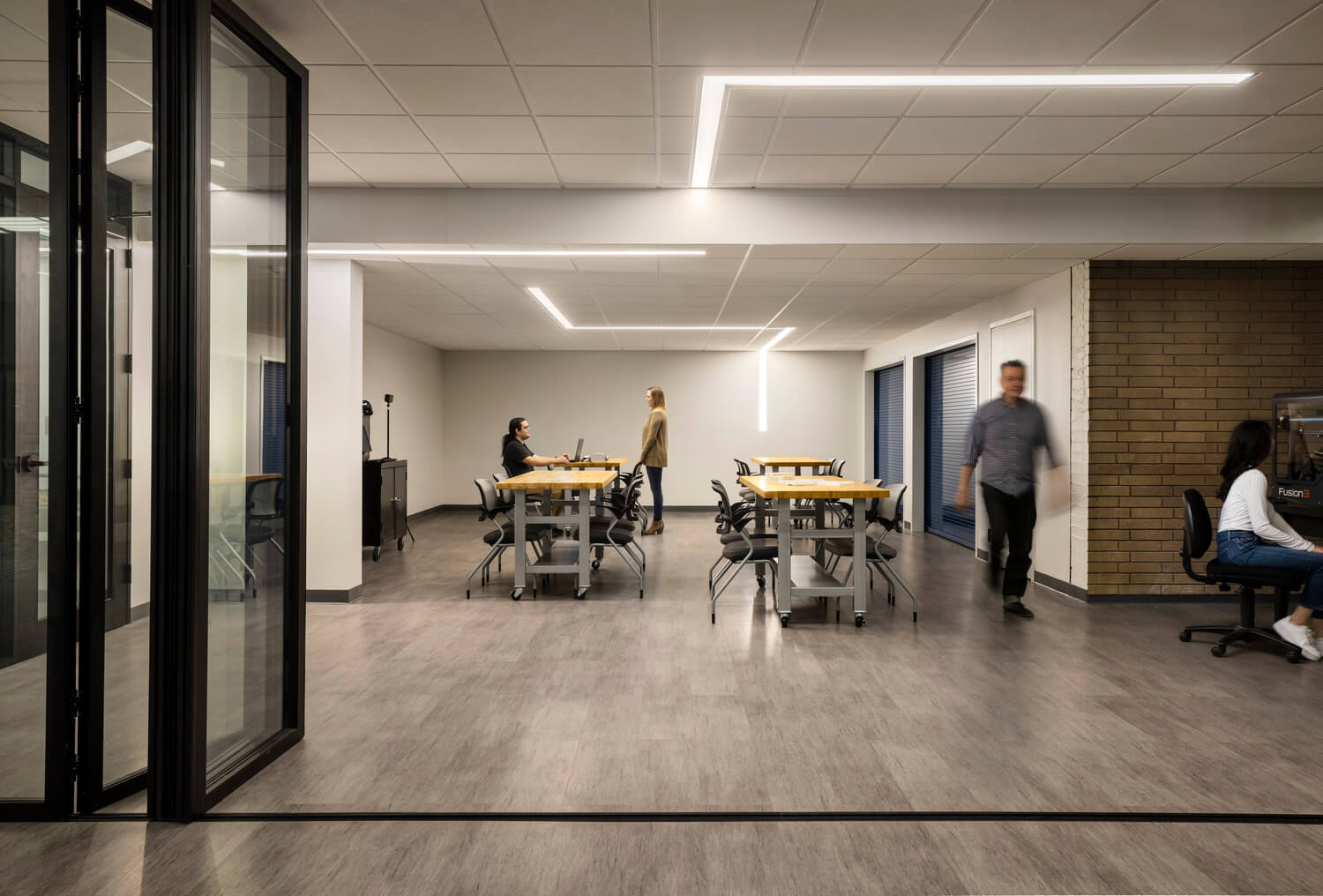 The renovation project enhanced and expanded services to the community within the existing library space, through the addition of an innovation center. The goal for this innovation center is to provide an open, flexible space that can be adaptable for community events and foster entrepreneurship, community projects, and business development. The center also showcases technology through its VR set-up and 3D Printer, which is on display for all to see. Technology pods with roll down garage doors have been designed into the project to allow for individual and specialty functions in the space.