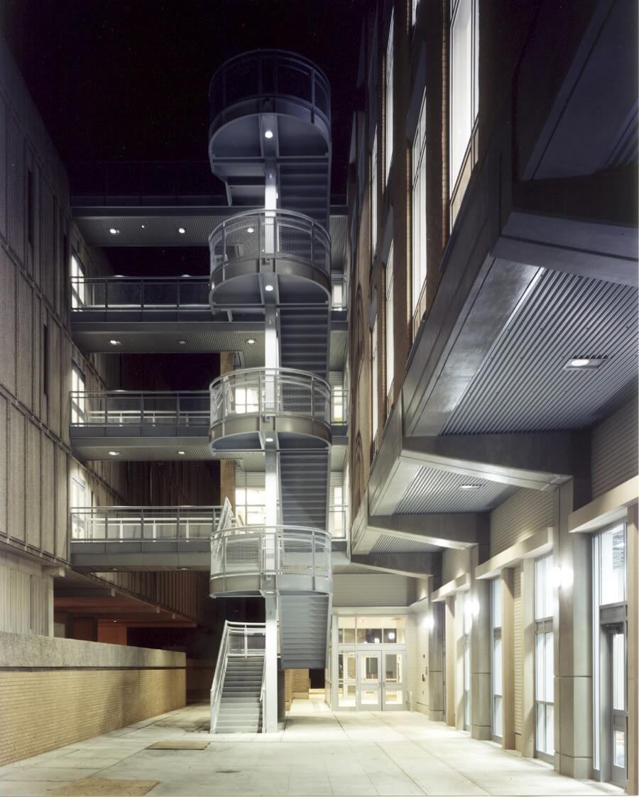An intimate courtyard is formed by the existing Stern building and the Israel Environmental Sciences Building. Its inspiration comes from the local New Orleans architecture. The connecting stair and bridges help activate the space and make it a vibrant social center for the sciences. Introductory chemistry teaching labs occupy the most inviting floor. Careful planning combines individual ventilated cabinets adjacent to shared computing platforms; these labs cluster around a computation lab which enlivens the inner courtyard.
