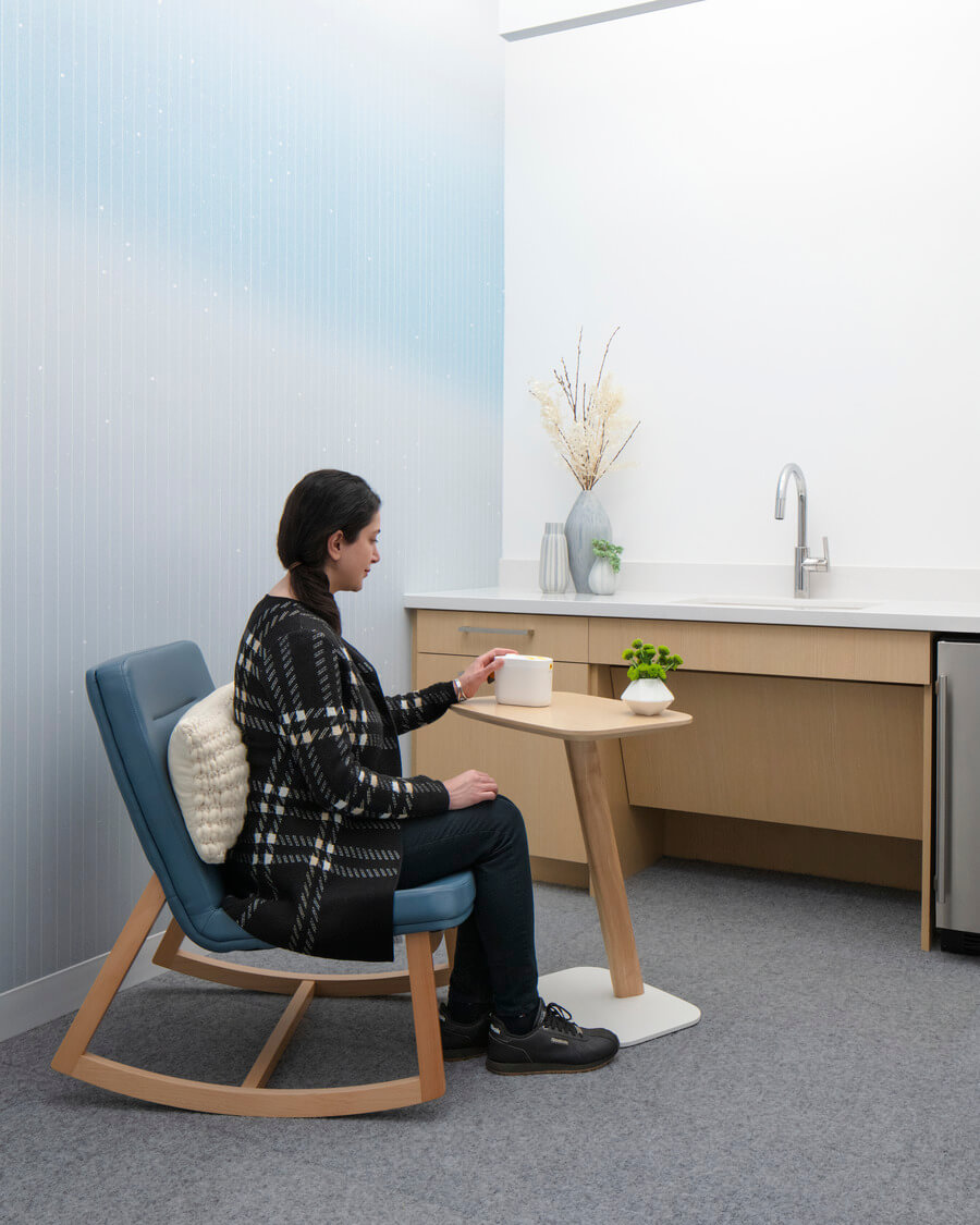 The renovated suite reflects empathy, evokes creativity, and encourages effortless exchanges, with the sense of health and wellness that a home for hospital leadership should embody. Designers reutilized much of the existing space with minimal demolition, optimizing existing walls, finishes, and lighting. In the new layout, 90 percent of the existing walls, doors, and hardware were reused, and 100 percent of the flooring was either salvaged and reinstalled in new spaces or reused and left in place. Any new flooring was carbon neutral, saving 17 tons of carbon dioxide.
