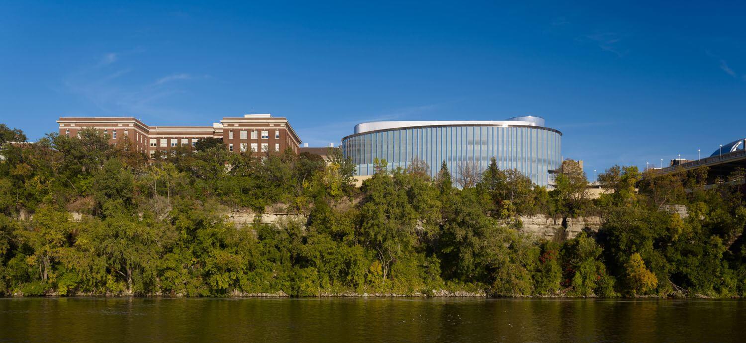 The Bruininks Hall site redefines the University’s southwest entrance with a welcoming network of arced paths and stairs along a 50-foot riverfront grade. Collectively, the landscape elements of the beautifully address the river and the architecture while providing a greater sense of place within the larger campus.