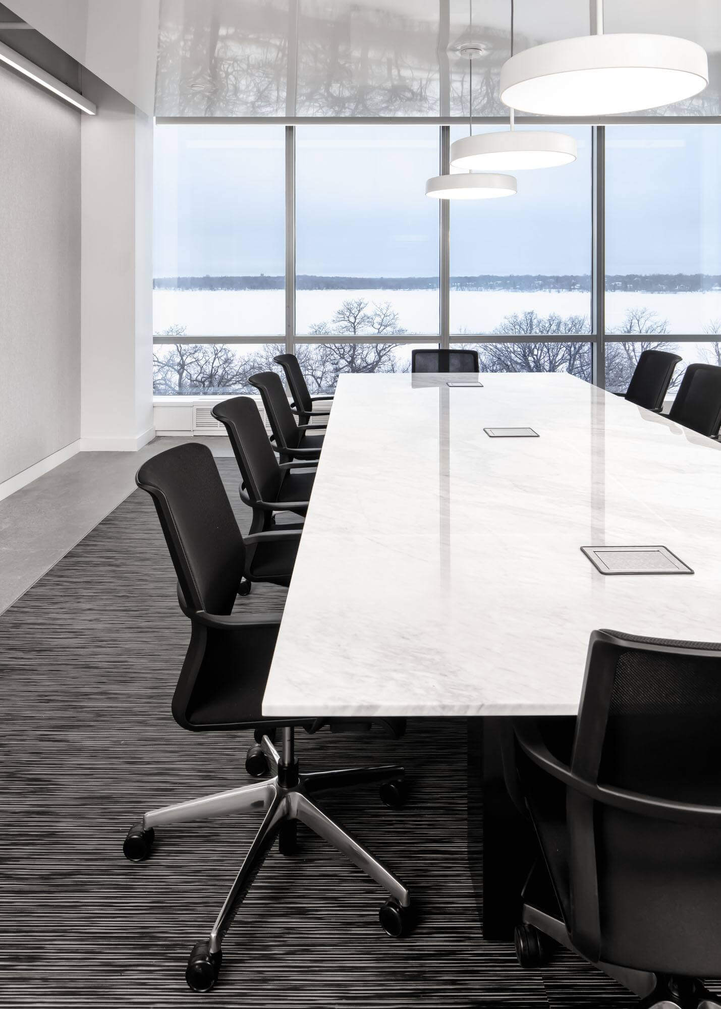 Whitebox Advisor’s workplace reflects the clean lines of its brand and logo—a solid white square within a white box on a black background. When the asset management company considered options for a new and expanded office, it first looked at other buildings before choosing the top floor of its existing location, a five-story commercial building overlooking Lake Bde Maka Ska south of downtown Minneapolis.
