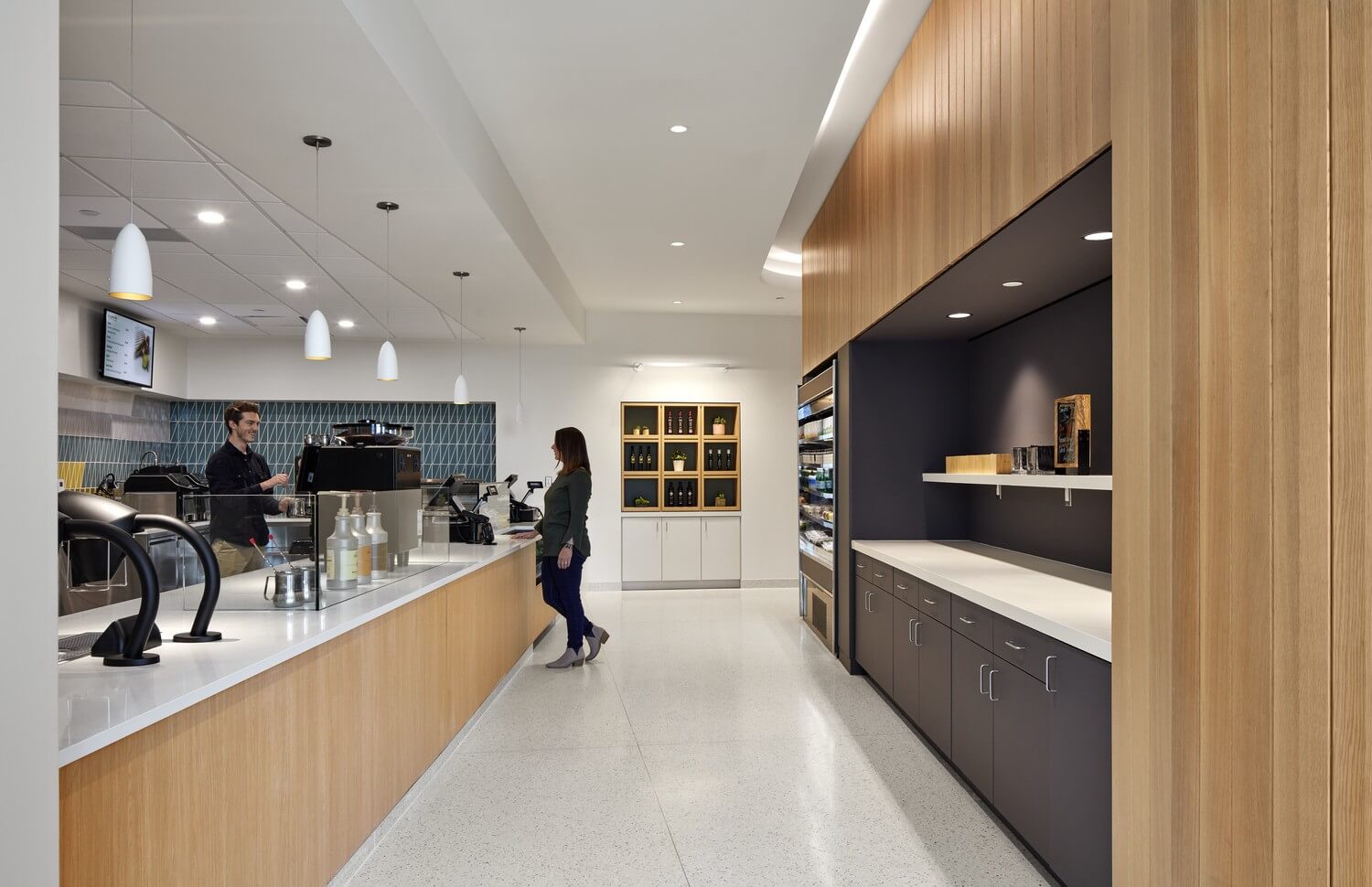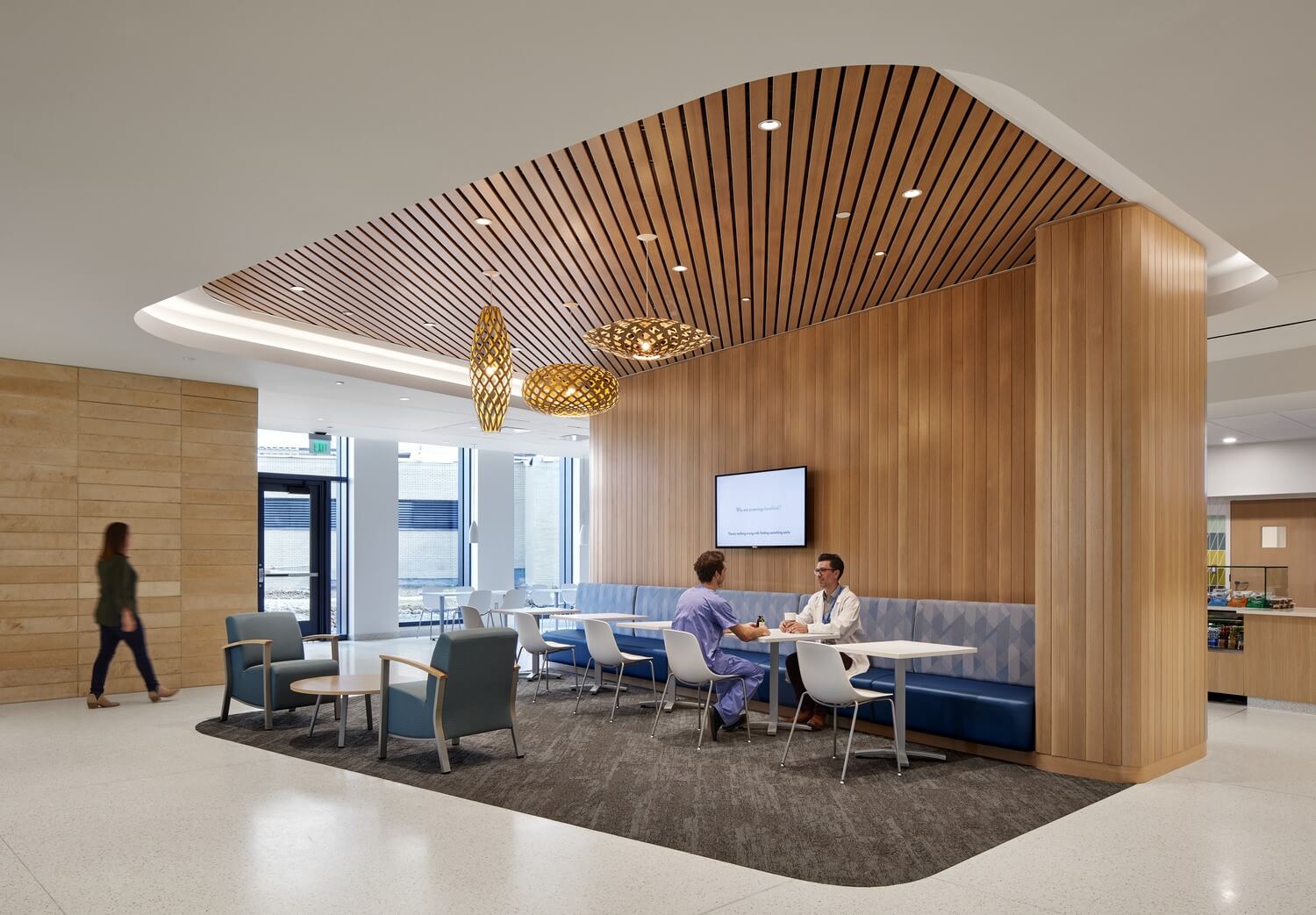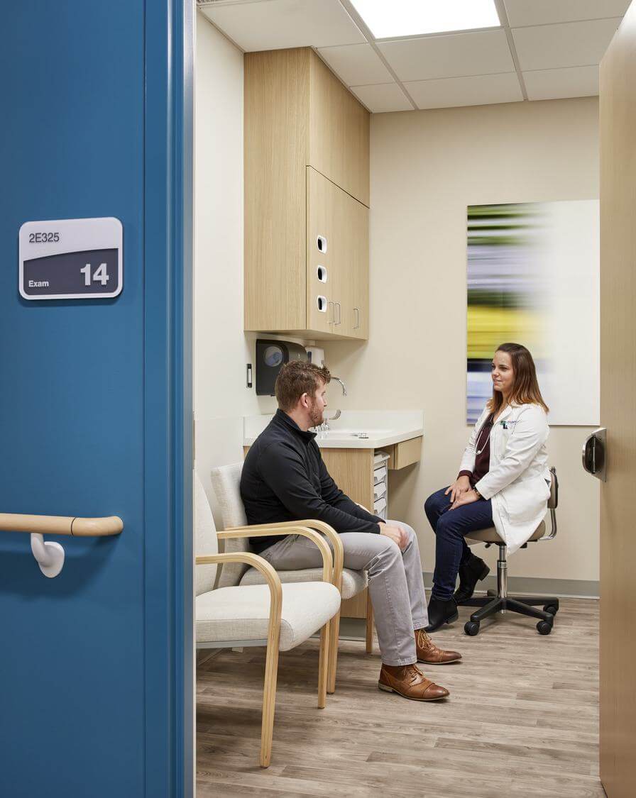 A strategic use of color identifies departments and reinforces wayfinding as patients and family move into specific care areas, such as exam rooms, imaging suites, or infusion bays. Life-energy color tones uplift spaces throughout. Daylight, views, and access to the outdoors provide a sense of calm and tranquility.