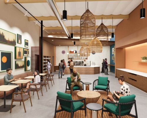 Rendering of a building exterior with trees and seating areas