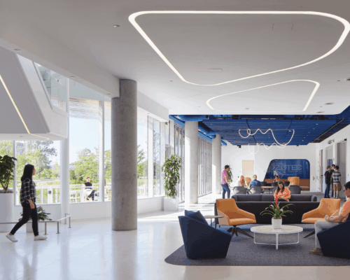 Interior of a modern office space featuring a sleek reception desk, overhead geometric lighting fixtures, and people engaged in various activities. One individual is seated near the entrance, another is walking towards a hallway, and a third is interacting near a work area with digital screens.