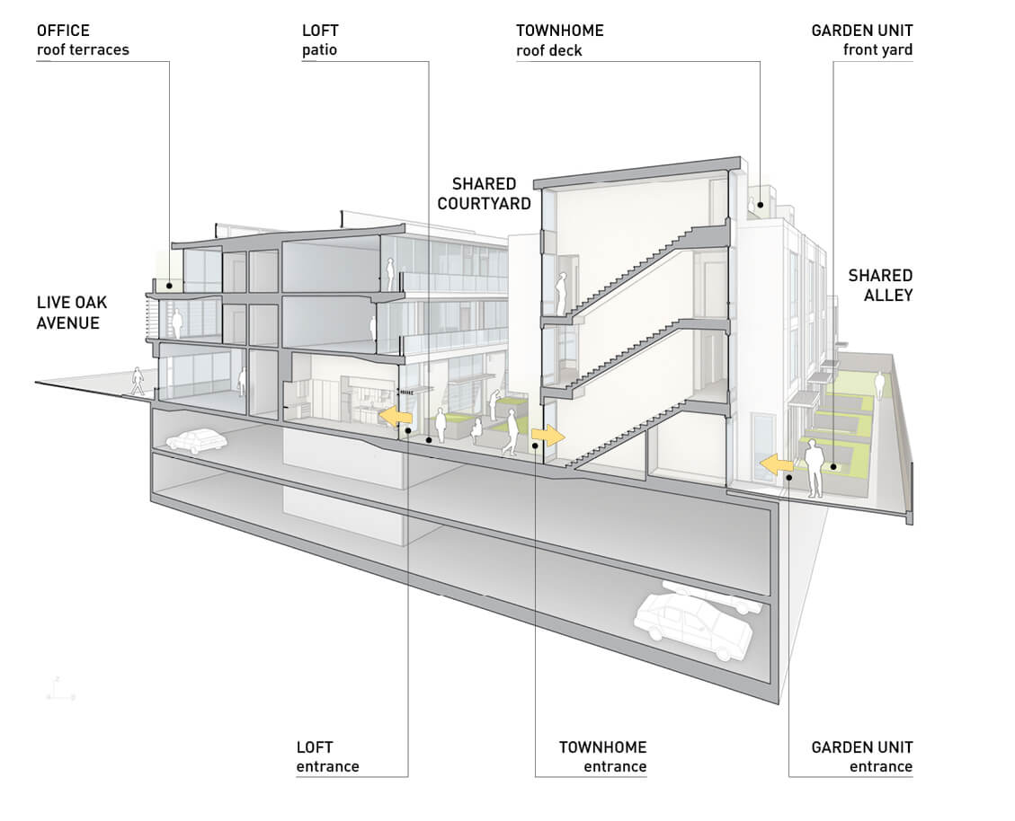 Imagining a new way of delivering dense urban infill is tricky; creating an integrated project with two separate lots beholden to two sets of planning rules is even trickier. Combining four housing types for seventeen graciously sized units, 25,420 rentable square feet of class-A office space, and an outdoor community space on a 30,000-square-foot site while maximizing the floor area ratio for each element? Now that sounds like fun!