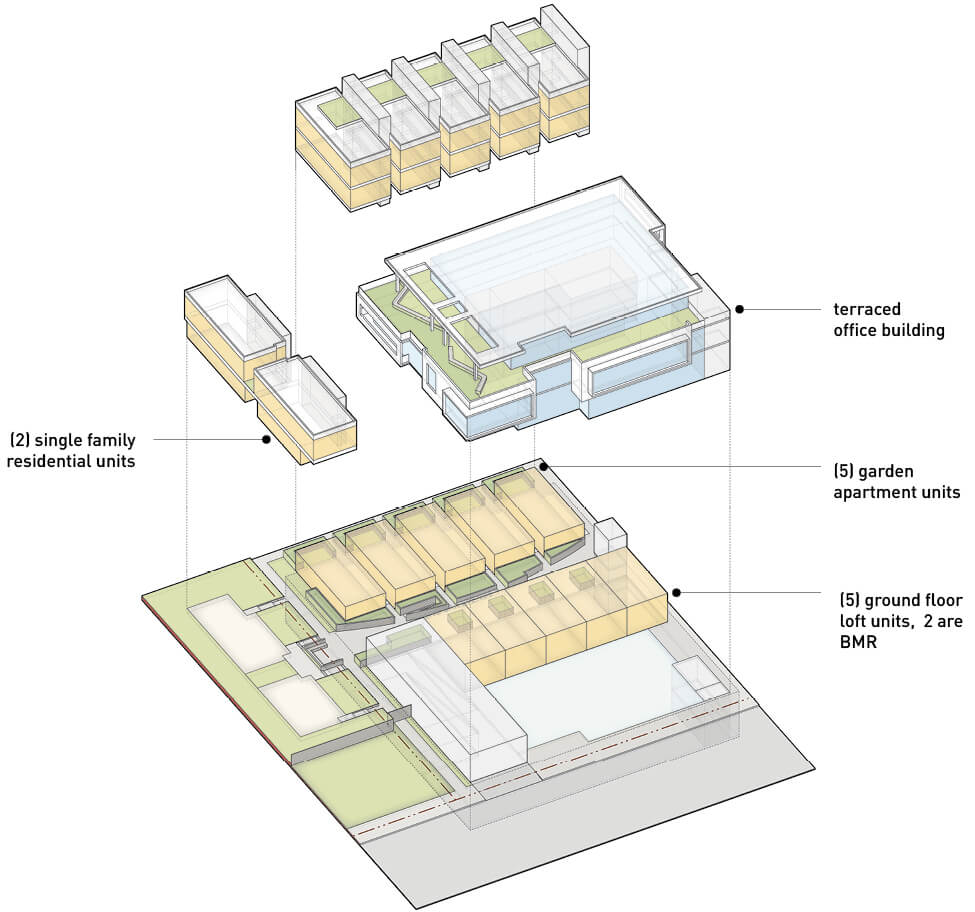 Working with developer Dan Minkoff and later John Fong, brick reconfigured the game with the aim of maximizing FAR for both housing and office wherever possible. For the office component, height was a more limiting factor than FAR. Building with concrete is slow going but would allow for three floors and high ceilings worthy of Class A office space while making it possible to add ground-floor residential lofts that face a courtyard at the back of the building. Building most of the residential as individual, wood-frame buildings reduced costs, created separate entries for each dwelling, and removed the need for an additional elevator or exit stairs. Less cost for infrastructure made way for investment in terraces, roof decks, and more gracious living spaces.