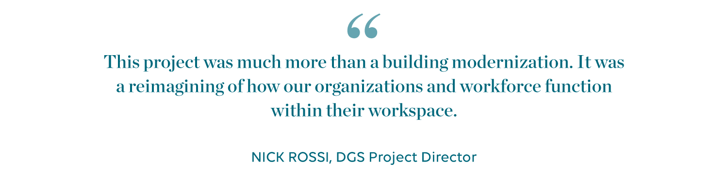 As the project progressed, from design through construction, DGS felt it was important to communicate the agency’s vision for the facility—how it was designed to be used, as well as potential impacts on employees and their work. “This is not just about changing our physical location; it’s about transforming the way we work, collaborate, and innovate,” officials wrote in a newsletter focused on the transition.