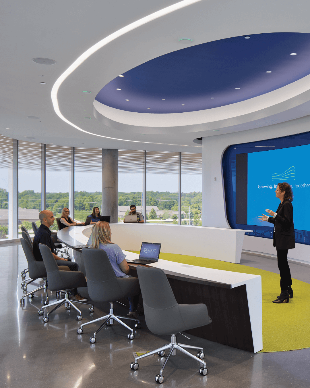 Zotec’s headquarters in Carmel, Indiana, reflects its mission to simplify healthcare for patients and providers through technology. The design of the contemporary workspace blends sleek, modern finishes with tactile, human-scale elements—striking a balance between innovation and warmth.